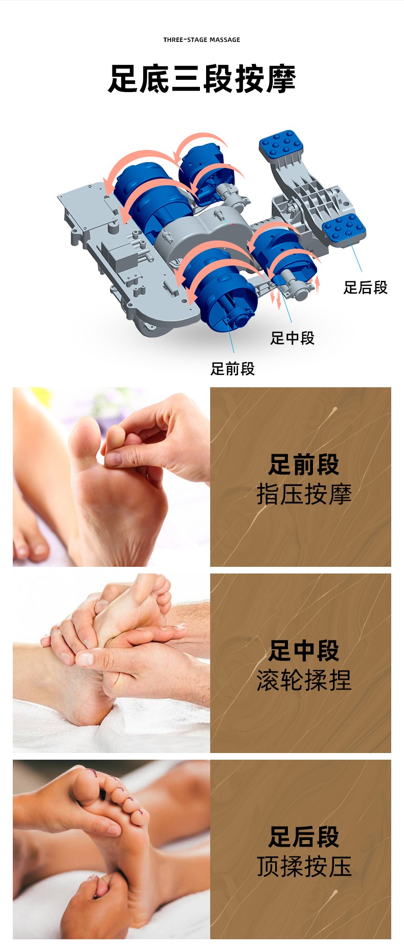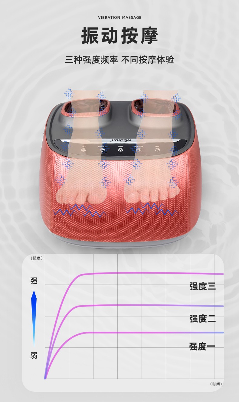 滾輪按壓(腳趾)、刮痧(腳弓)、捶打(腳后跟)按摩 (多模式,多強度);